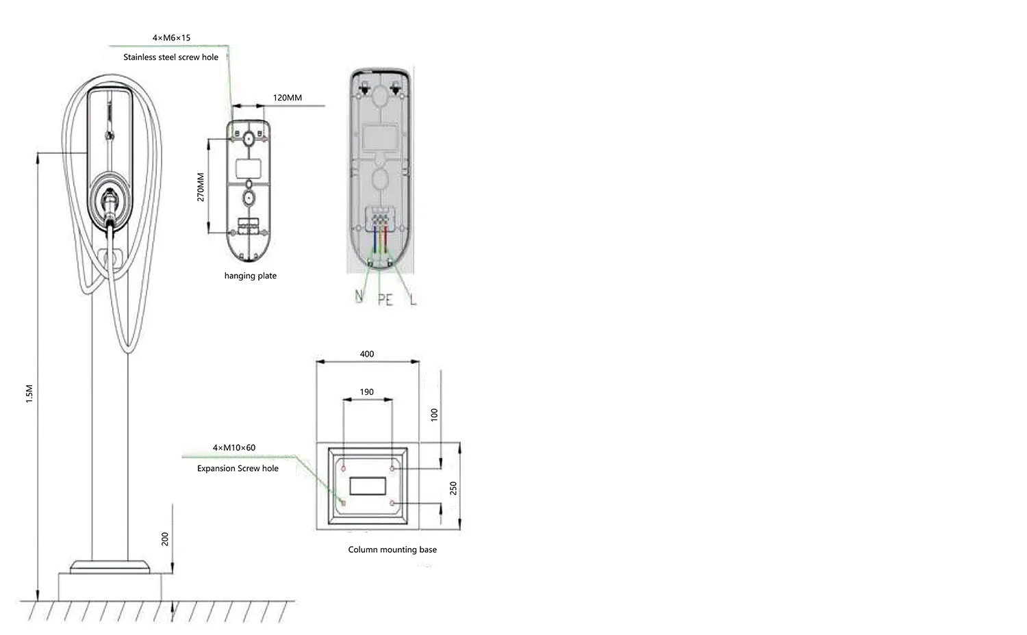1) चार्जिंग पाइल के लिए कंक्रीट फाउंडेशन की ताकत C25 होनी चाहिए। भूमिगत हिस्सा 400 मिमी है, और जमीन के ऊपर का हिस्सा 200 मिमी है। कंक्रीट के आयाम 400*250 मिमी हैं। नींव के केंद्र में एक दबी हुई आउटलेट पाइप होनी चाहिए, और नींव पर 4 M10*60 विस्तार बोल्ट लगाए जाने चाहिए।