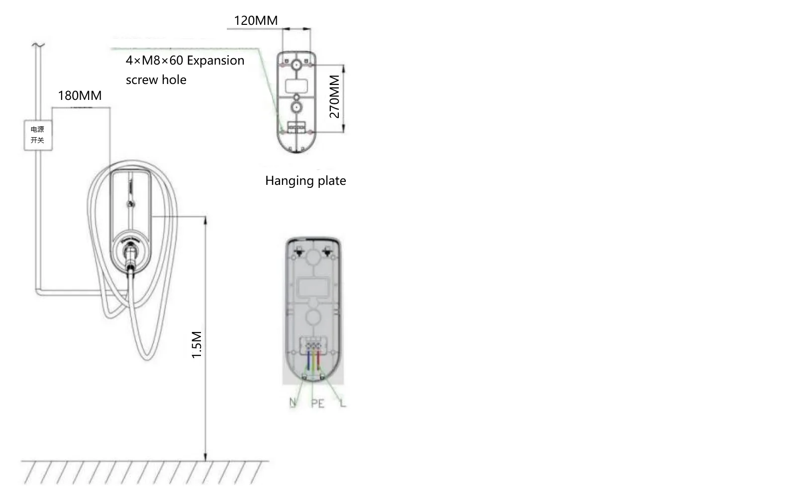 1) जमीन से चार्जिंग पाइल की ऊंचाई का संदर्भ डेटा (1.3-1.5 मीटर)2) पिछली प्लेट पर माउंटिंग होल की स्थिति के अनुसार दीवार पर बैक प्लेट पर माउंटिंग होल की स्थिति को चिह्नित करें।